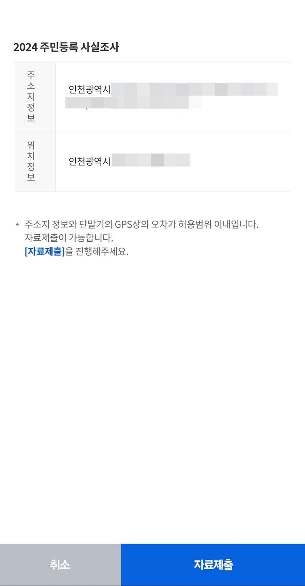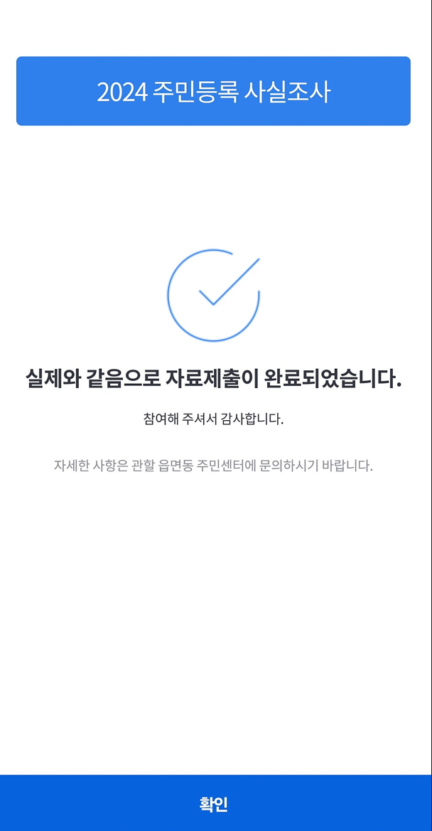 아래의 단계 대로 주민등록 사실조사에 참여 후 최종적으로 '자료제출' 버튼을 클릭하시면 주민등록 사실조사가 완료됩니다.