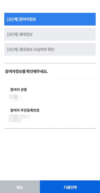 개인정보 활용 동의 및 참여하기 버튼을 누르신 후 다음 단계로 넘어갑니다.