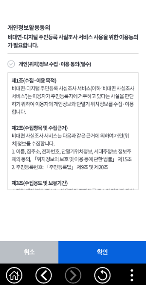 간편 인증으로 개인 정보를 인증한 후 주민등록 사실조사 화면으로 이동합니다.