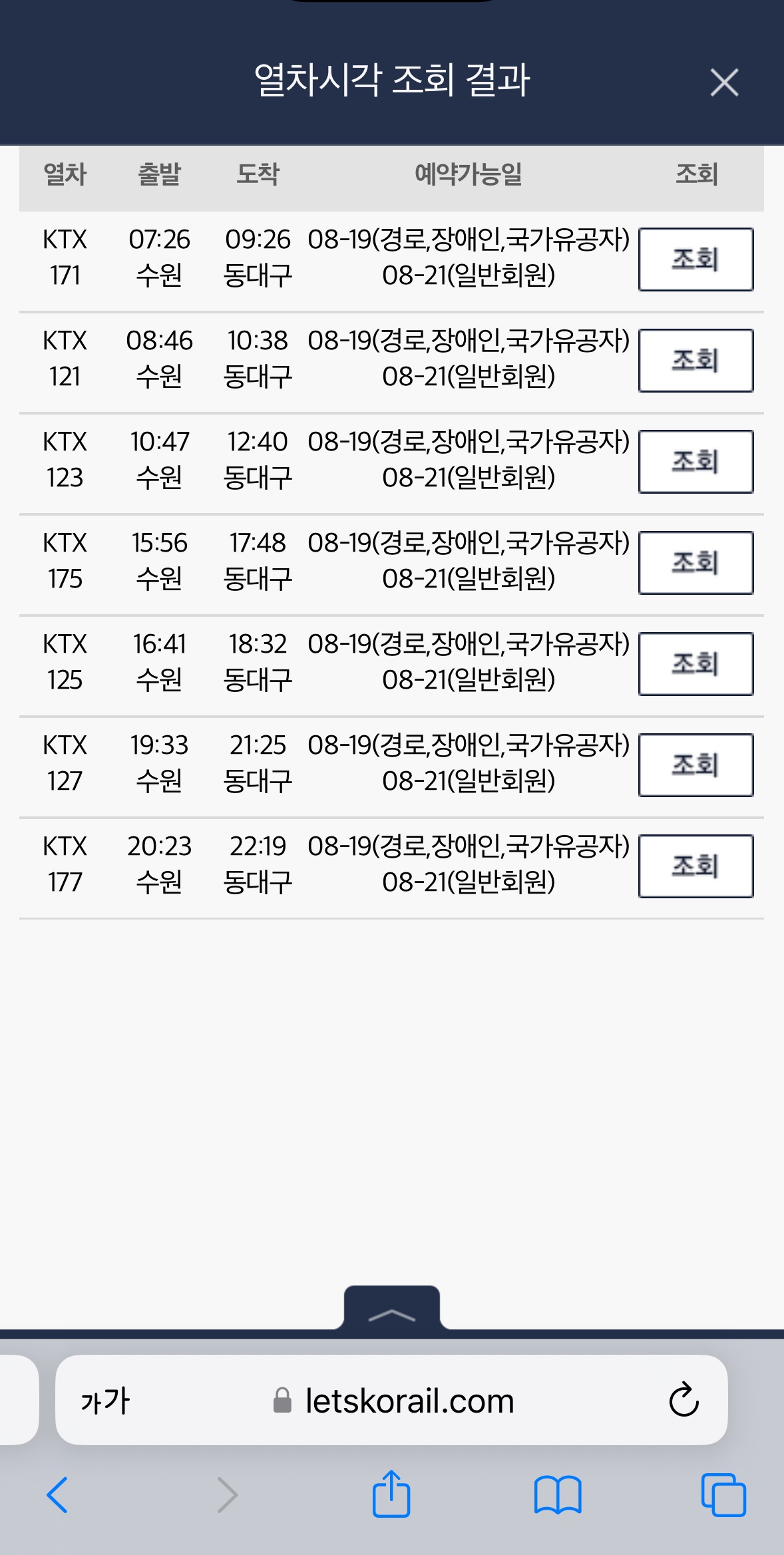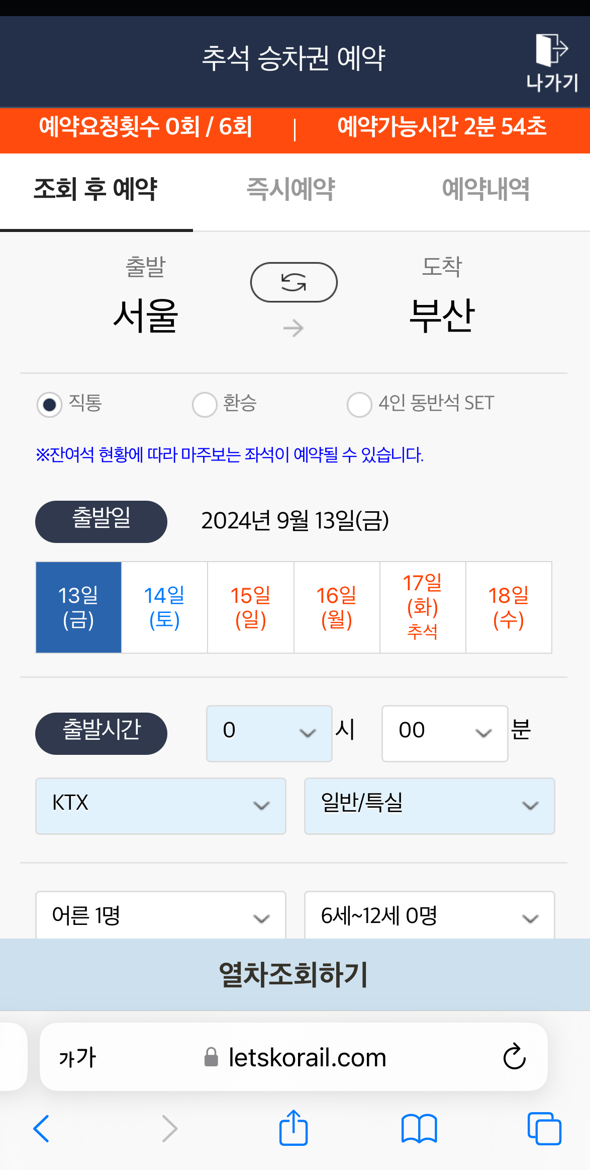 코레일 추석 예매페이지로 오시면 위와 같은 페이지가 뜹니다. 하단의 열차시각조회를 누르시고 탑승하시려는 날짜와 시간, 행선지, 열차종류를 입력하시면 탑승가능한 열차의 시간표가 나열됩니다. 탑승하시려는 열차를 딱 하나만 정하지 마시고 여러 후순위를 두어 매진 됐을 때를 대비하시는 게 좋겠습니다.