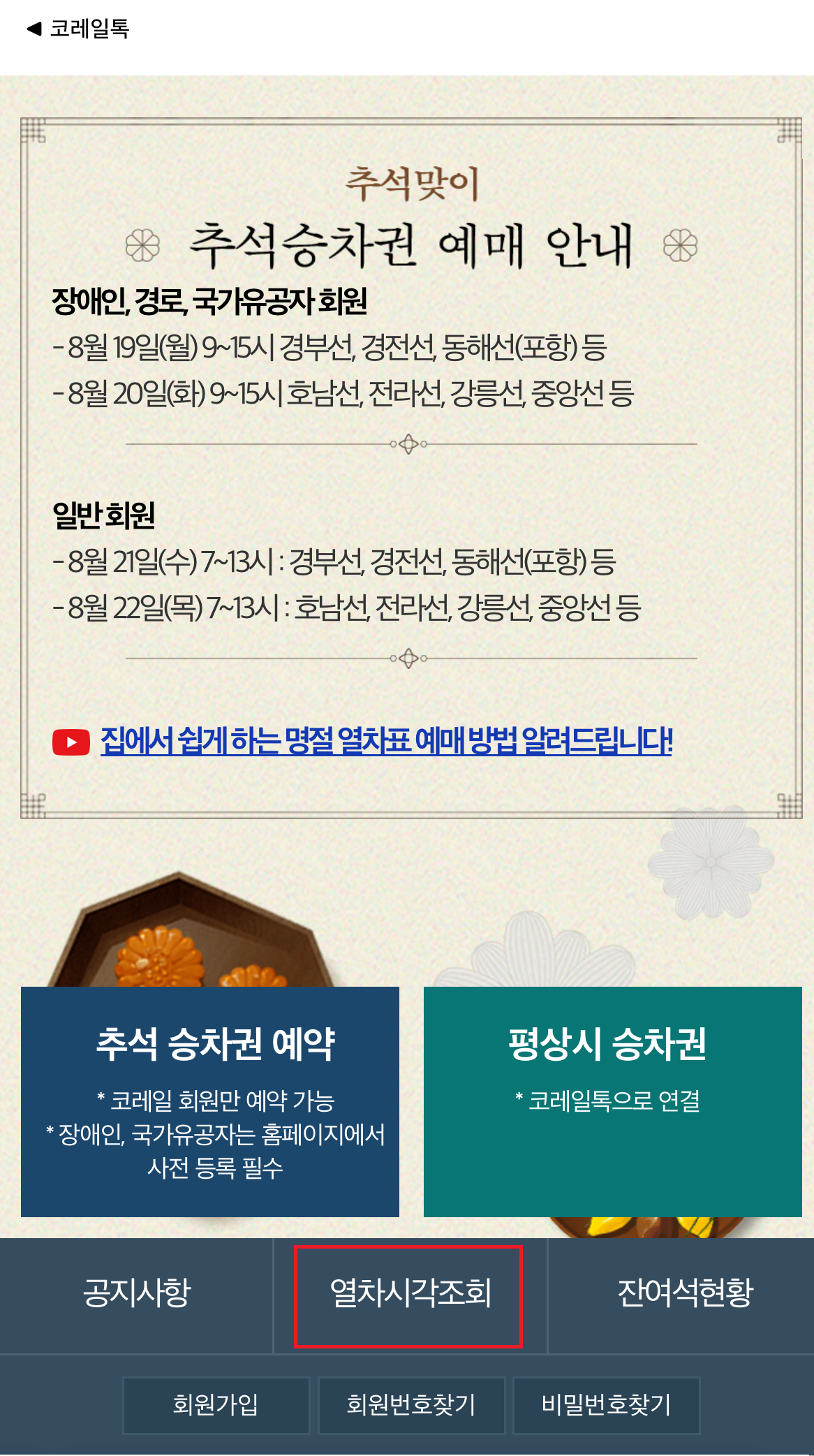 경로, 장애인, 상이유공자는 명절 예매 전용 홈페이지에서 사전 여행정보를 미리 저장하고, 예매 당일 불러오기 기능을 이용할 수 있으니 유념하시길 바랍니다.